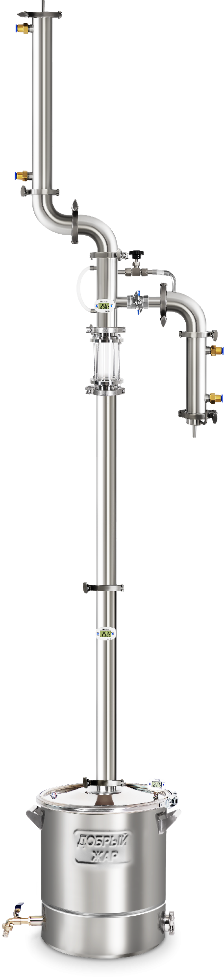 Электронный термометр установлен на крышке бака и в узле отбора, что позволяет контролировать температуру восходящих спиртовых паров.